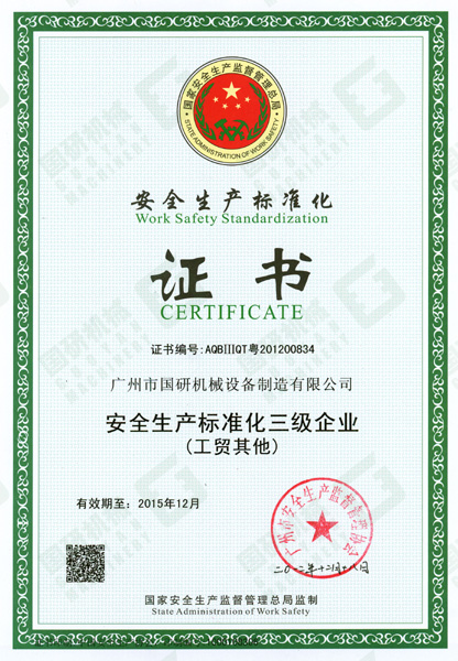 2012年12月24日,国家安全生产监督管理总局为IM网页版登录入口_IM(中国)公司颁发了《安全生产标准化企业证书》,这意味着我司已达到《广州市工业企业安全生产标准化评定办法》及《广州市工业企业安全生产标准化评定标准》的要求。