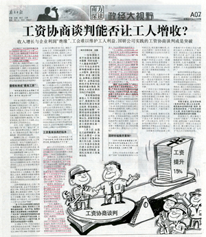 7月14日,《南方日报》以《工资协商谈判能否让工人增收?——国研公司实践的工资协商谈判或是突破》为题,用三分之二大版篇幅报道广州市IM网页版登录入口_IM(中国)设备制造有限公司实践工资集体协商的成功经验。